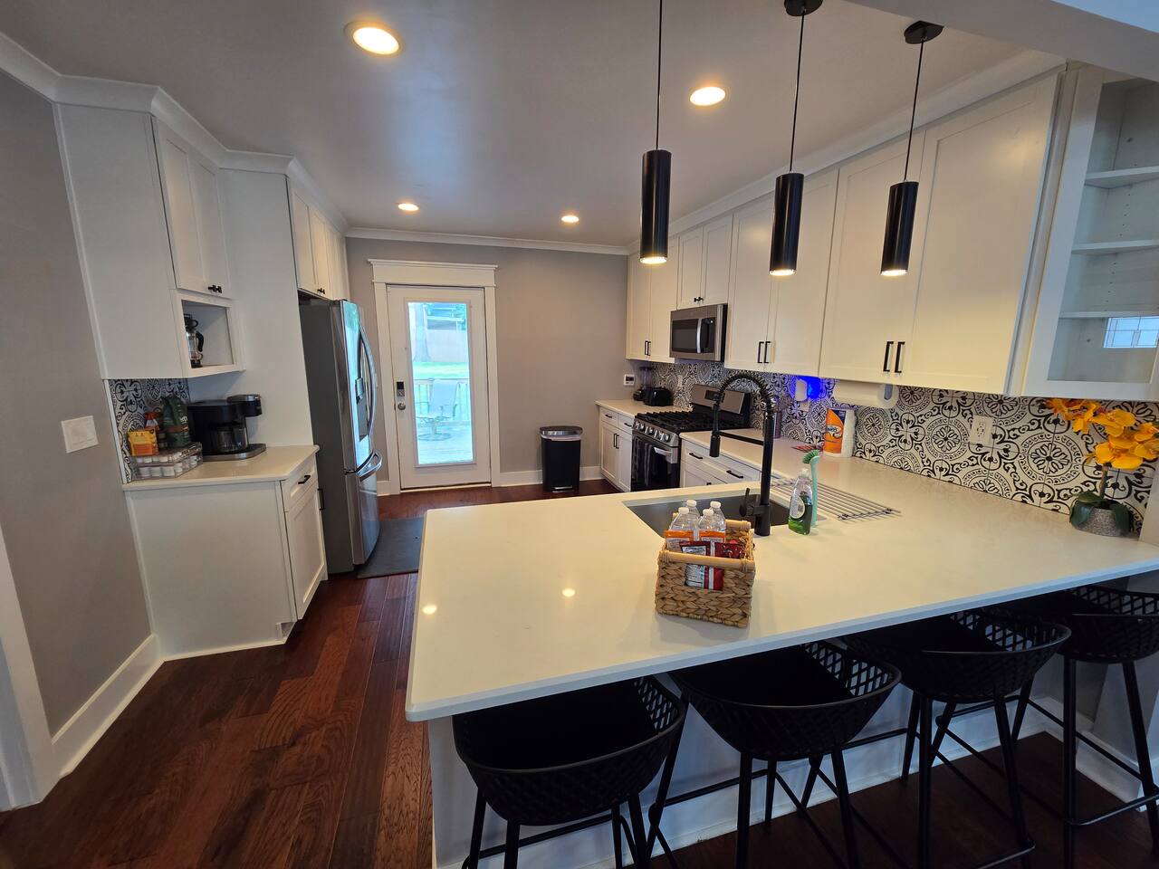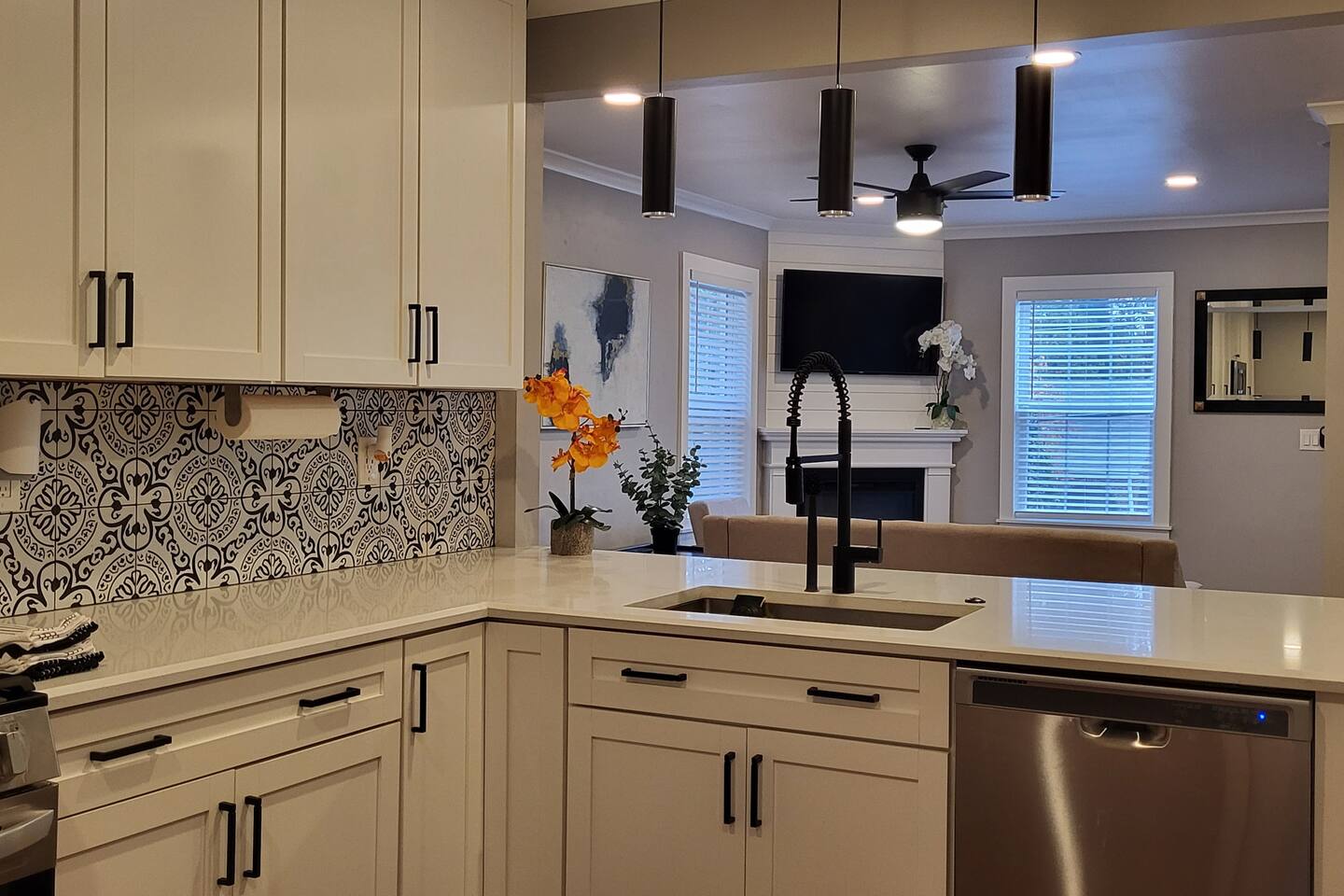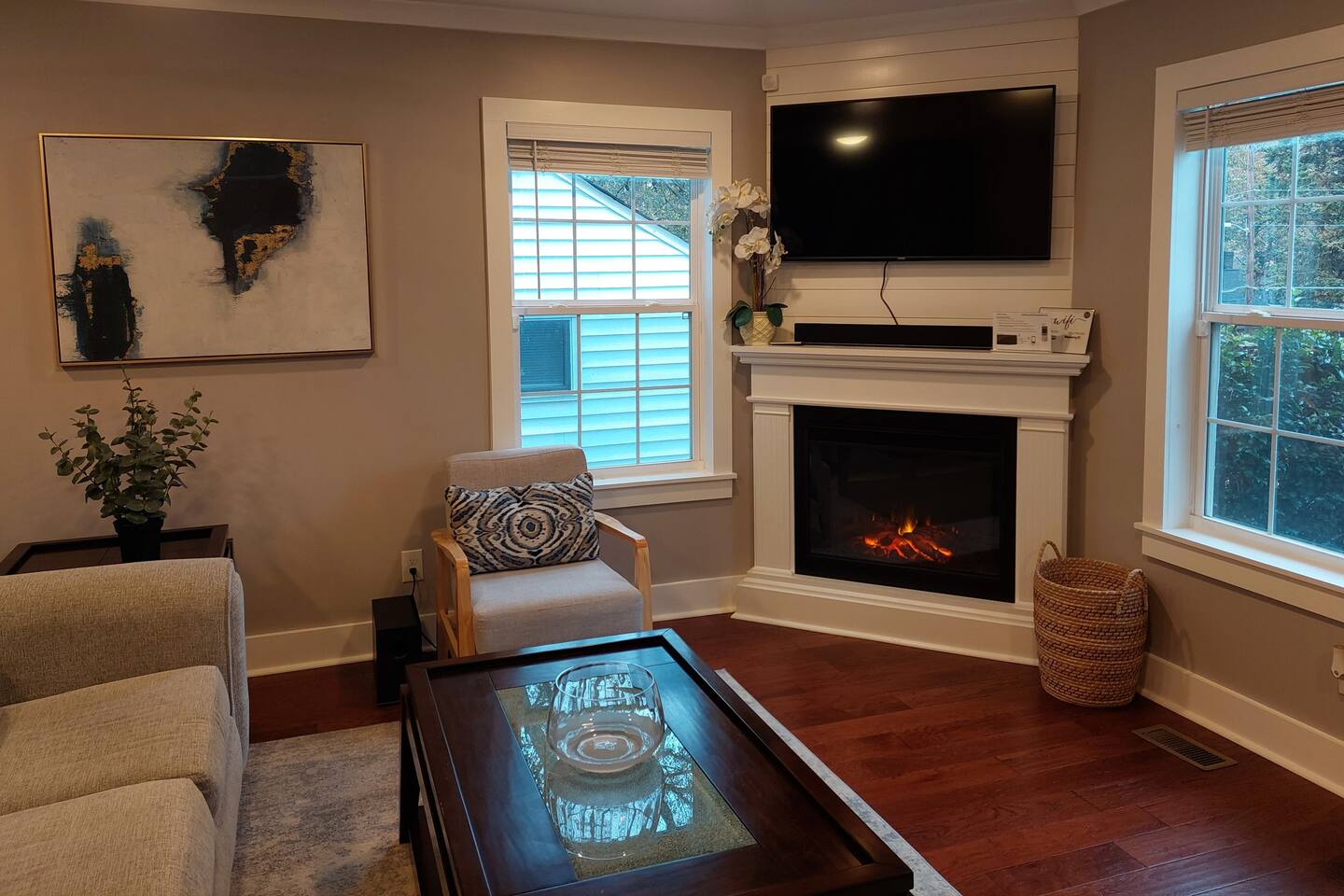 Living & Dining: - Bright and spacious living room with hardwood floors, an electric fireplace, Bluetooth soundbar, and smart TV. - Family dining area plus private office for work or quiet time. Kitchen: - Fully renovated with quartz countertops, stainless-steel appliances, and eat-in peninsula seating. Bedrooms & Baths: - Main level: Bedroom with private en-suite. - Second floor: Large primary suite with en-suite bath and walk-in closet, plus two bedrooms sharing a double-sink bath. - Smart TVs in every bedroom. - Office can convert to an additional bedroom if needed. Outdoors & Parking: - Private fenced backyard with patio for relaxing. Driveway parking for multiple cars, plus free street parking.